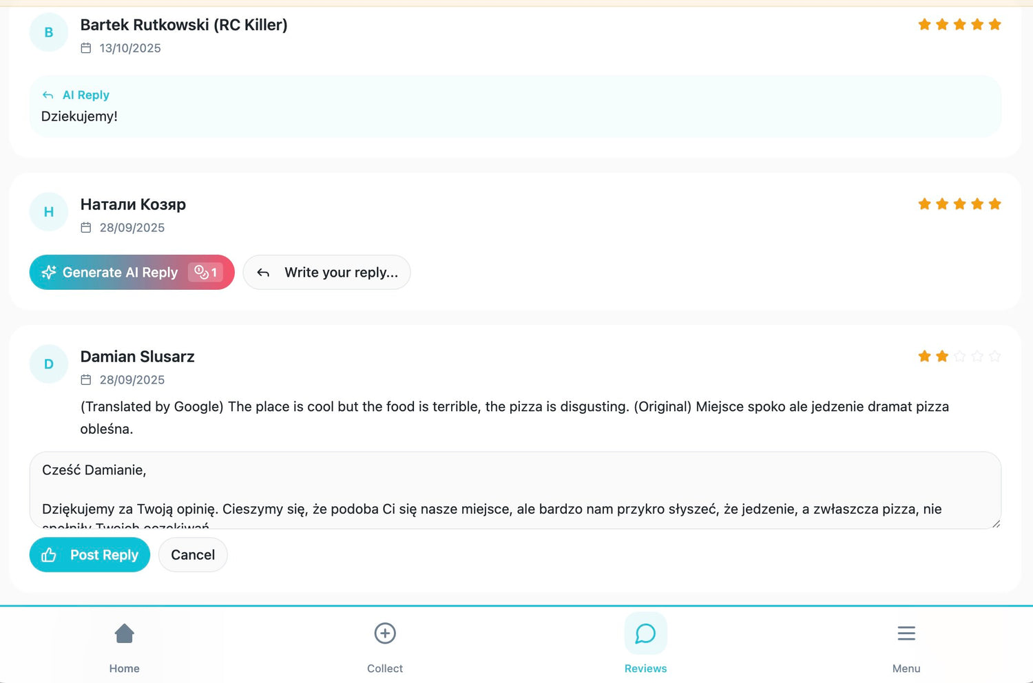 Owners waste hours replying manually or ignore reviews completely, losing trust and visibility. -
